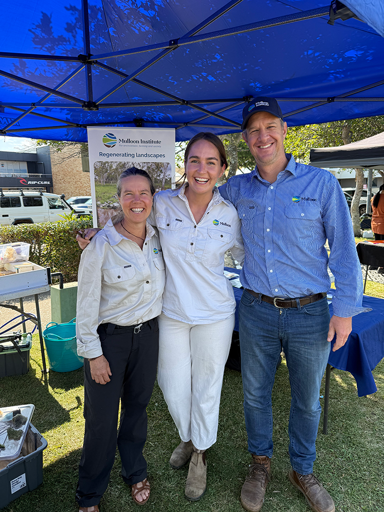 At the stall, Matt Smith (Project Delivery & Engagement Manager, pictured at right), Annabel Manning (Landscape Planner, pictured centre) and Brooke Cunningham (Landscape Planner, pictured at left) welcomed passersby, explained Mulloon Institute’s rehydration work and fielded questions about restoring hydrology, regenerating plant communities and building climate resilience.