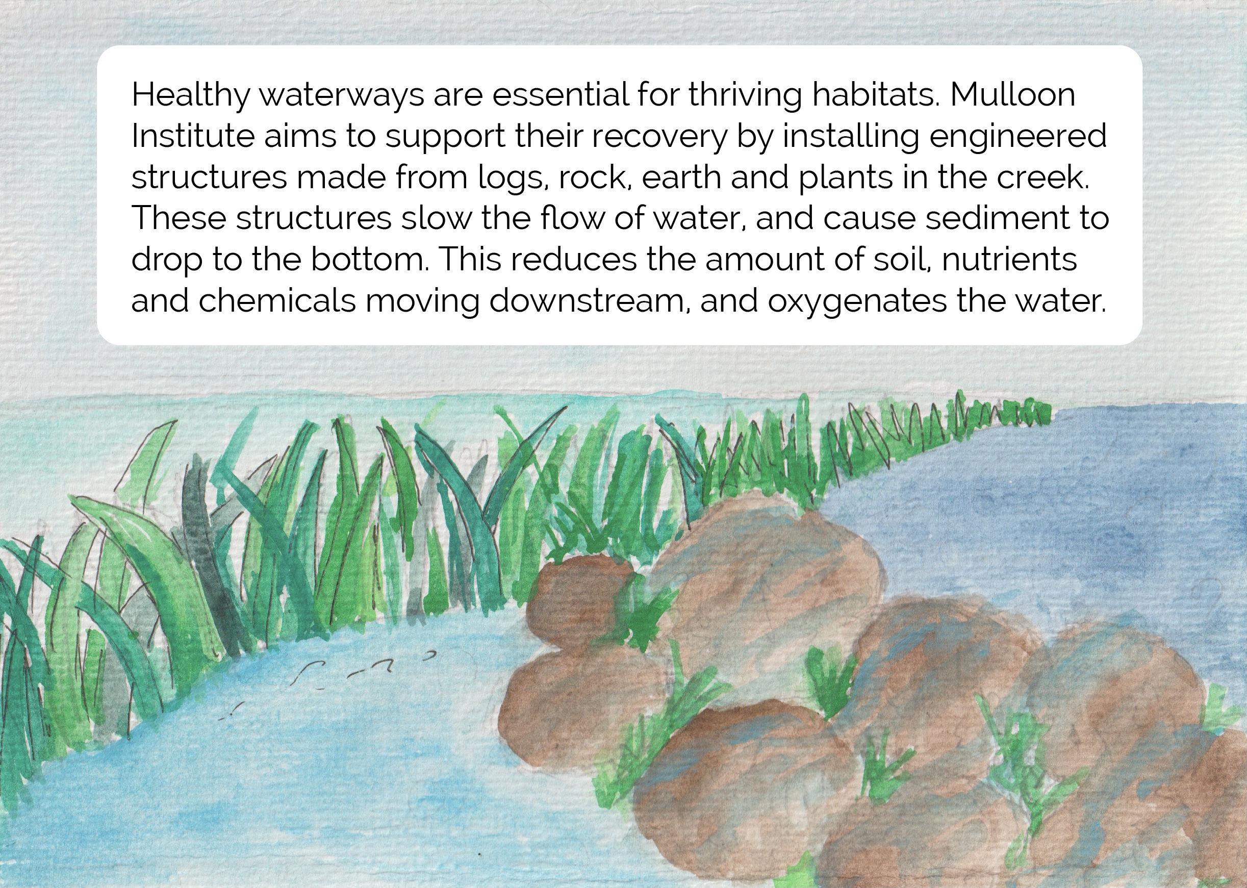 For their Mulloon-engaged project this semester, we invited them to provide visually engaging material to accompany the scientific data we will share in storymaps and other content about the way the in-stream structures create habitat for frogs, platypus and other creatures. The team got to see some examples at Lorrina (revisit the blog here), and figured out how to wed together their skillsets with a vibrant multi-media approach.